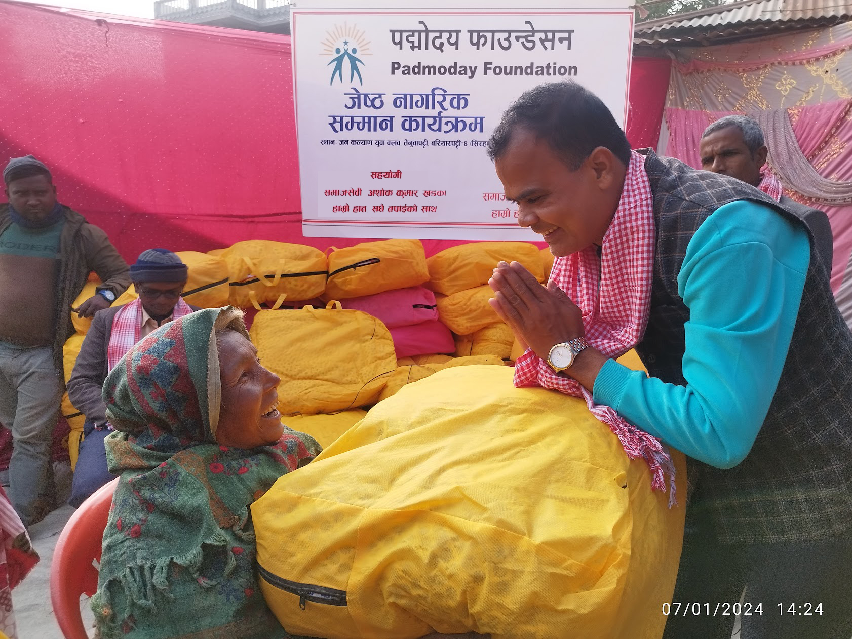 Bariyarpatti, Siraha –07 January 2024, In a heartfelt gesture to support the elderly during the cold winter months, Padmoday Foundation organized a Senior Citizens Respect Program in Bariyarpatti Rural Municipality, Tenuwapatti. As part of this initiative, more than 100 senior citizens were provided with winter warm fiber blankets to help them stay warm and comfortable.